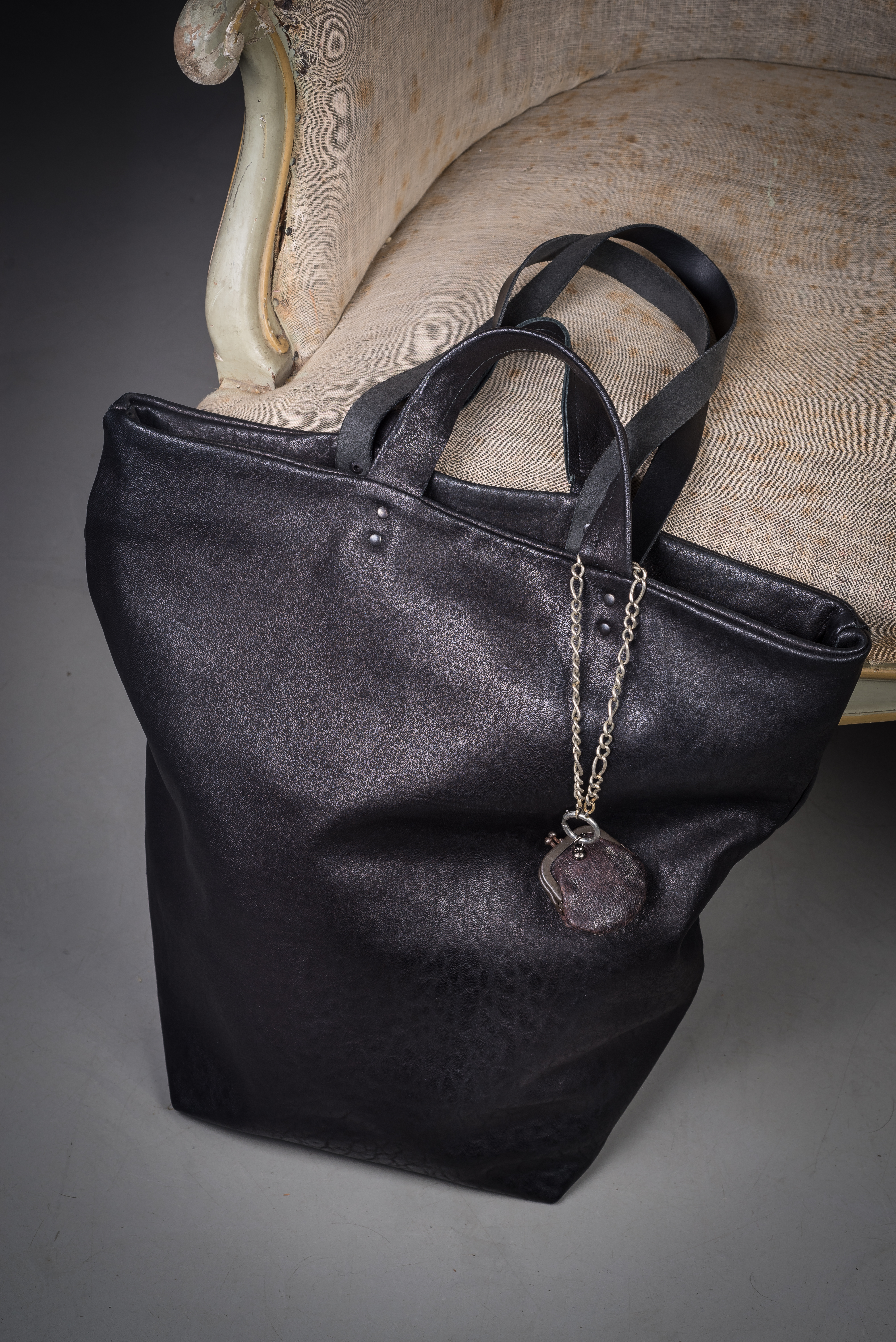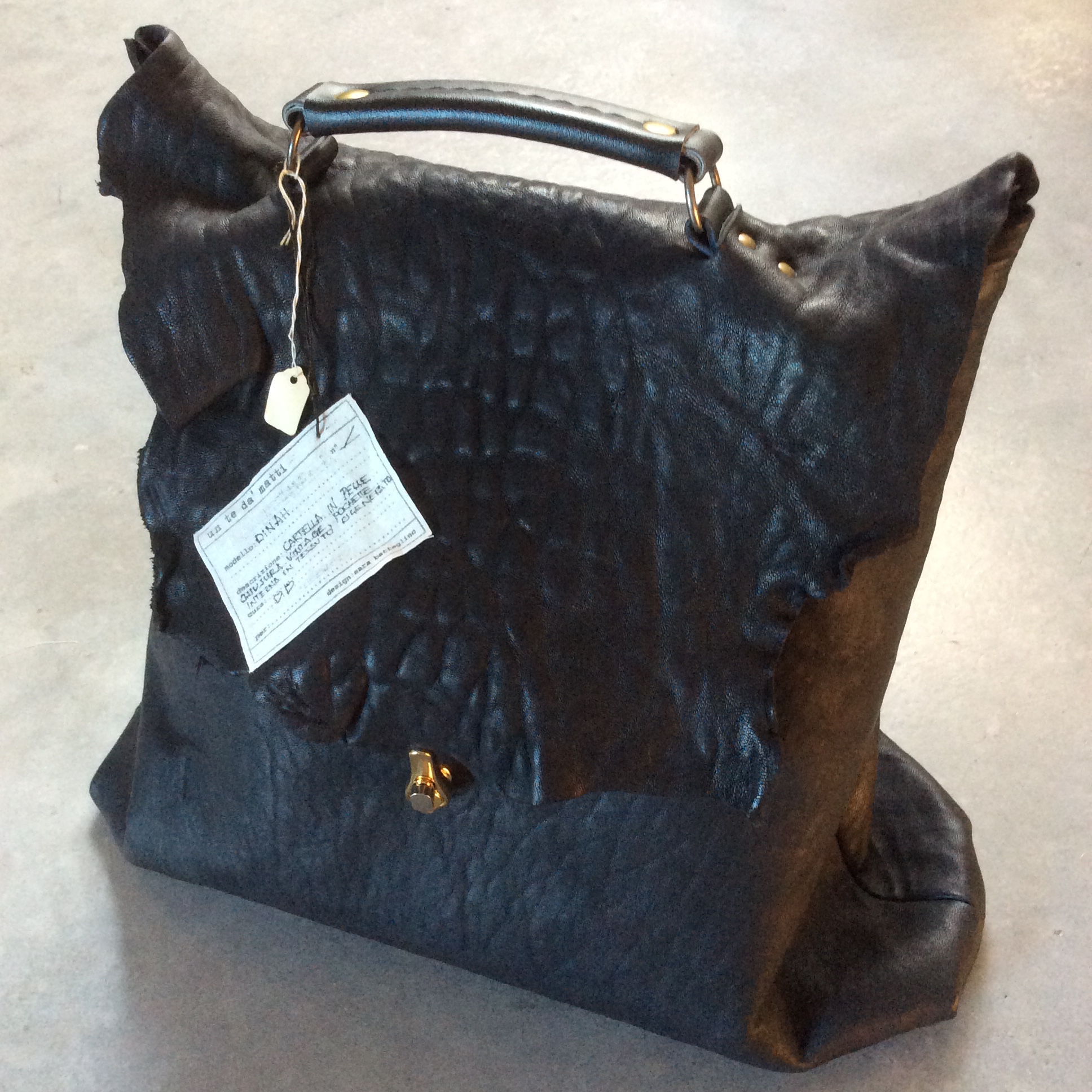Una serie di borse in pelle a tiratura limitata, alcuni modelli foderati con tessuti rigenerati a partire da antica biancheria per la casa in canapa, lino e cotone altre, invece, sfoderate, dalle forme insolite, piccole buste che conterranno ricordi o quotidianità o ancora cartelle, pratiche shoppers e tracolle; le chiusure e parte della minuteria sono recuperate da borse vintage, apparecchiature militari e molto altro, frutto di appassionate ricerche nei mercatini delle pulci in giro per l’Europa e l’Italia; antichi gemelli da uomo spaiati o vecchi ma preziosi bottoni (una mia grande passione fin da piccola), chiudono invece i piccoli accessori.