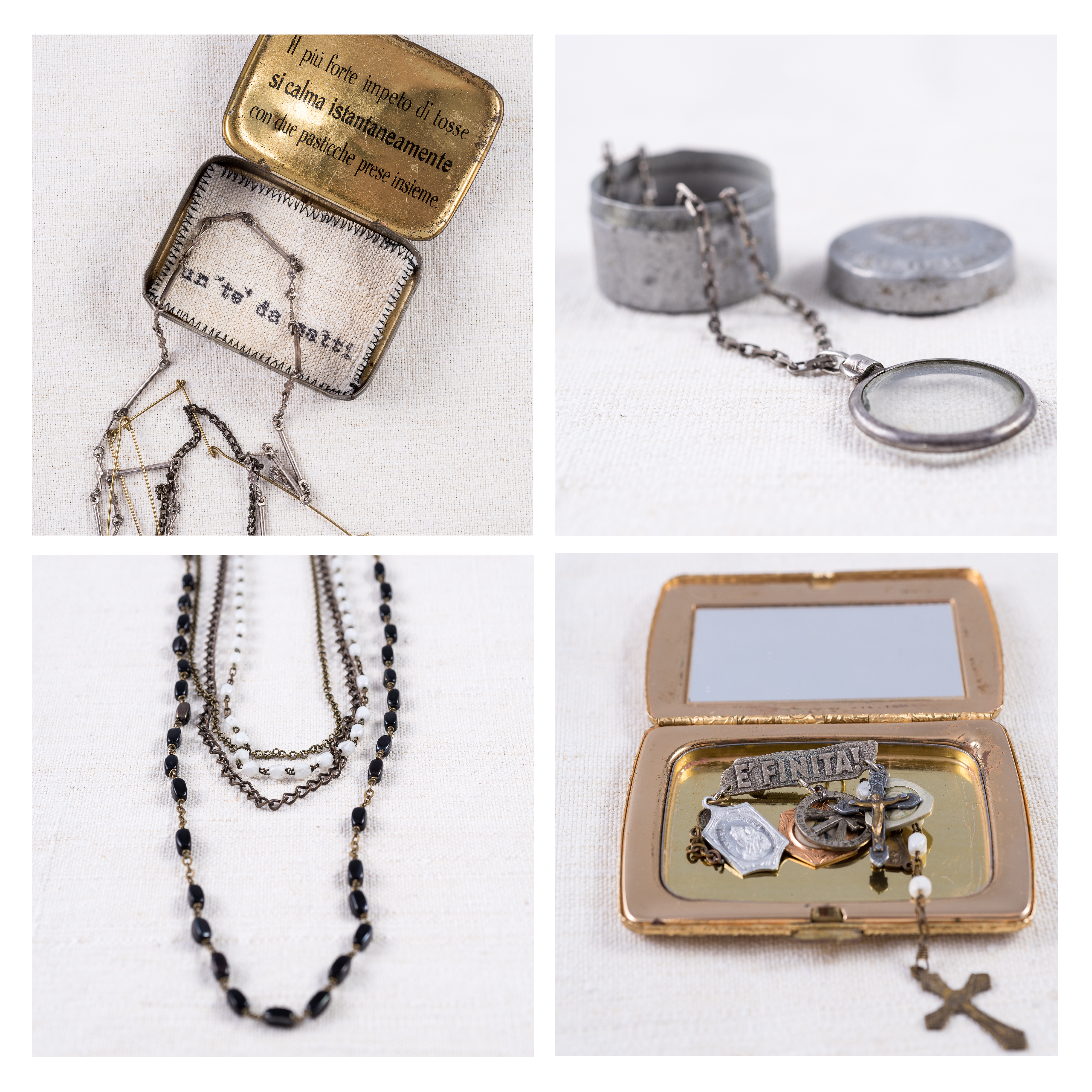 una serie limitata di bijoux, pezzi unici e numerati che montano ciondoli, amuleti, piccoli portamonete, catene e medaglie d’antan, diventano un pensiero divertente se completati dal packaging insolito , sempre diverso, come piccoli astucci vintage da medicinali, vecchi portapillole o scatoline in latta, scelti accuratamente uno ad uno; vecchie catene da orologio da tasca materializzano il tema del “tempo” che fa da filo conduttore a tutta la collezione.